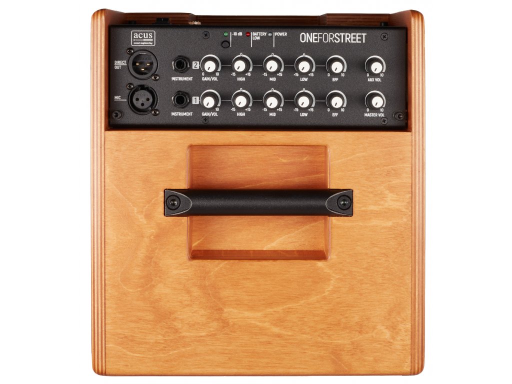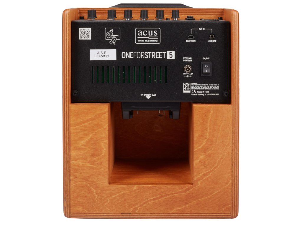 ONEFORSTREET 5 WOOD je kombo pro akustické nástroje vhodné pro pouliční muzikanty/buskery. Nabízí dotažený design aparátů Acus, kdy kabinet z březové překližky doplňuje čelní kovová mřížka, dva kanály se dvěma nástrojovými vstupy a jedním mikrofonním, moderní funkce (kompatibilita s Bluetooth přes přibalený přijímač Artesia BT-1, streamování propojením XLR Direct Out výstupu a Aux In konektoru) a možnost napájení bateriemi s výkonem až sedm hodin na jedno dobití.