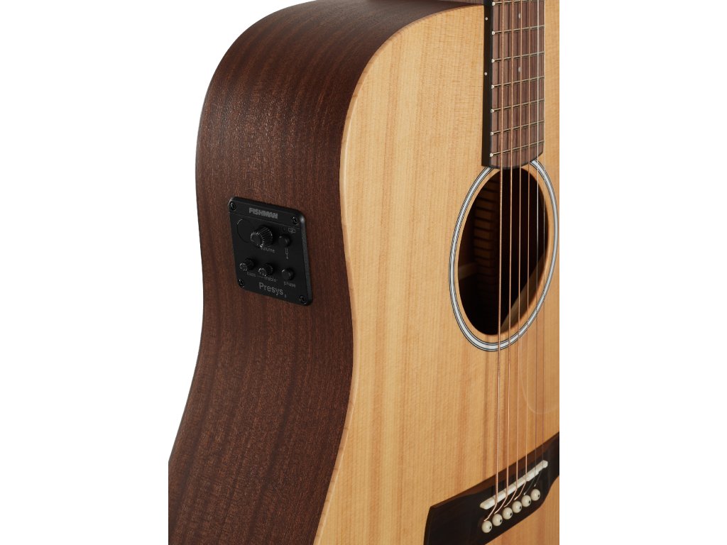 Možnost ozvučení nabízí elektronika Fishman Presys II s ovladačem hlasitosti, dvoupásmovým ekvalizérem, invertorem fáze a zabudovanou ladičkou. Struny jsou přes nultý a sedlový pražec z kosti uchyceny v chromovaných die-cast mechanikách a kobylce z pau ferro. Střídmé, ale stylové, zpracování podtrhuje transparentní pickguard a rozeta složená z černobílých linek.