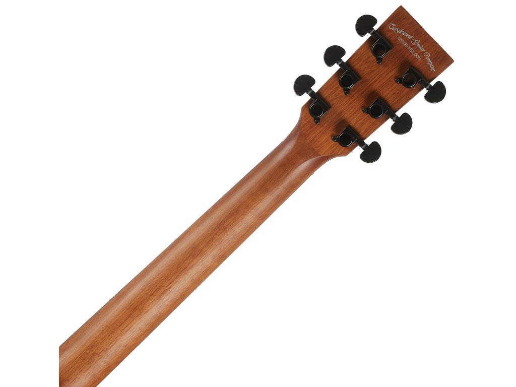 Struny jsou přes nultý a sedlový pražec z materiálu NuBone uchyceny v černých firemních die-cast mechanikách a ebenové kobylce. Stylové zpracování podtrhuje jednoduchá rozeta z javoru a mahagonu a černobílá lemovka těla.