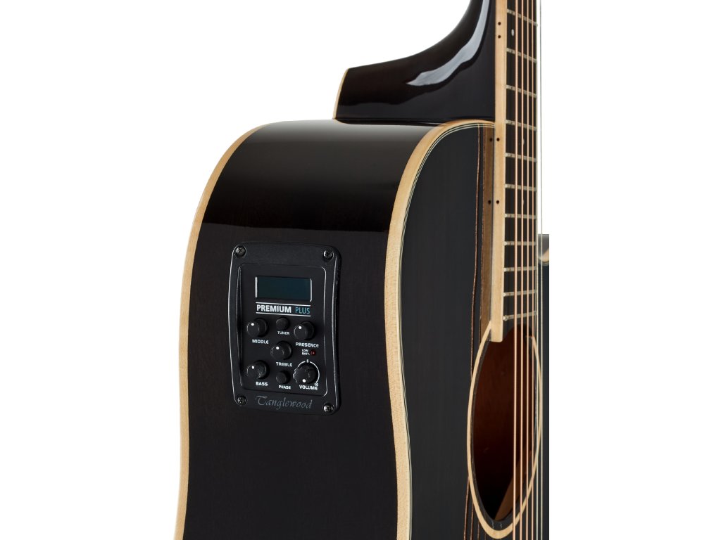 Možnost ozvučení nabízí firemní preamp TW Premium Plus s čtyřpásmovým ekvalizérem, funkcí Phase a integrovanou ladičkou. Struny jsou přes nultý a sedlový pražec z materiálu NuBone uchyceny v chromovaných die-cast mechanikách a kobylce z kompozitu. Pěkné zpracování podtrhuje javorová lemovka těla a rozeta, středový proužek na zadní desce, perleťové poziční tečky (MoP) a finiš přední desky Black Shadow Gloss.