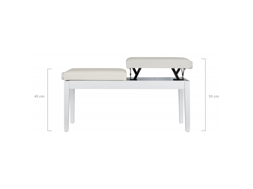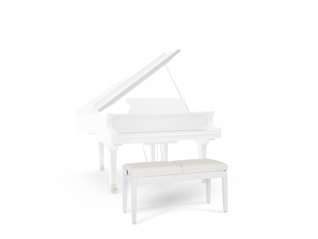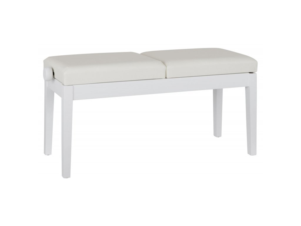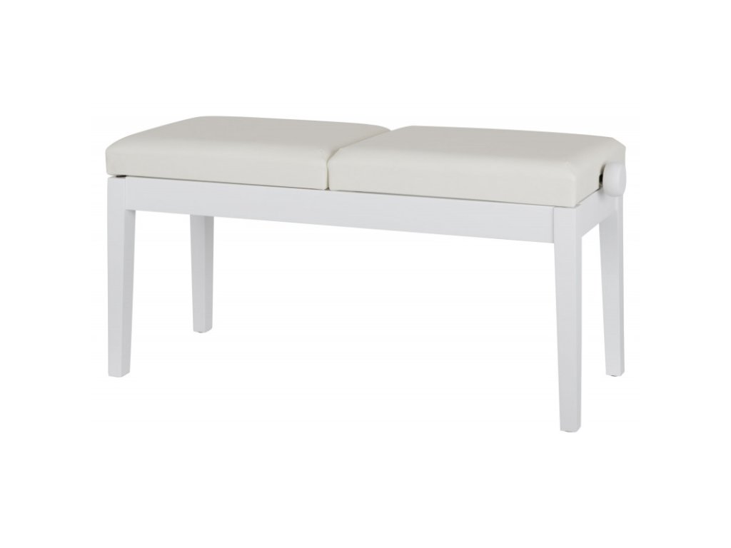 Klavírní stolička dvojitá v matném bílém provedení s bílým koženkovým sedákem výrobce Classic Cantabile. Sedáky jsou nezávisle výškově nastavitelné. Dvojitý křížový mechanismus na každé straně, pevná dřevěná konstrukce.