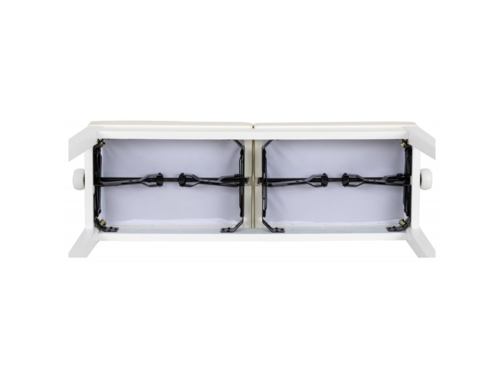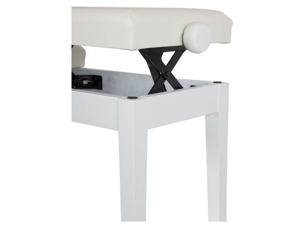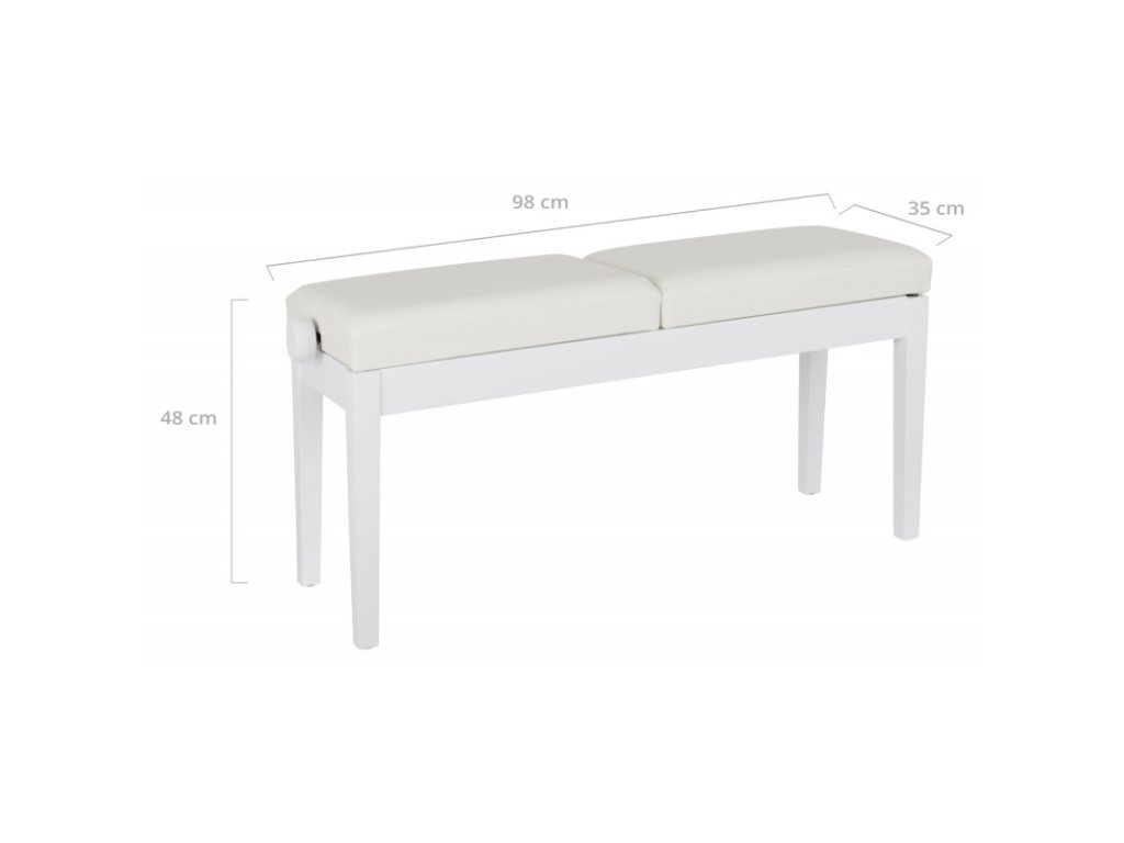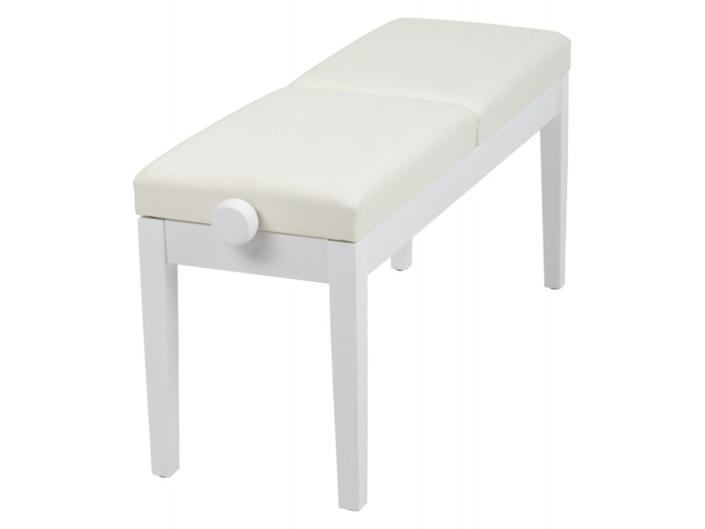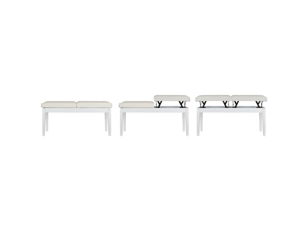 Klavírní stolička dvojitá v matném bílém provedení s bílým koženkovým sedákem výrobce Classic Cantabile. Sedáky jsou nezávisle výškově nastavitelné. Dvojitý křížový mechanismus na každé straně, pevná dřevěná konstrukce.