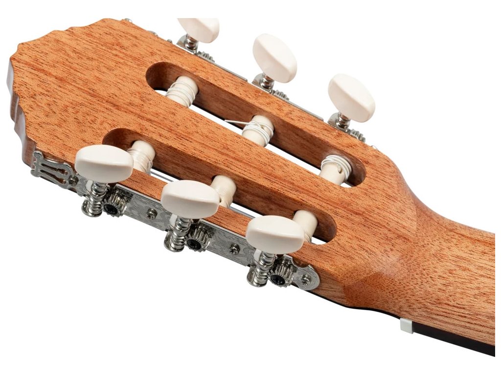 Struny jsou přes nultý a sedlový pražec z kosti uchyceny v klasických ladicích mechanikách a palisandrové kobylce. Pěkné zpracování podtrhuje lak rozleštěný do vysokého lesku, javorová lemovka a firemní logo na hlavici nástroje.