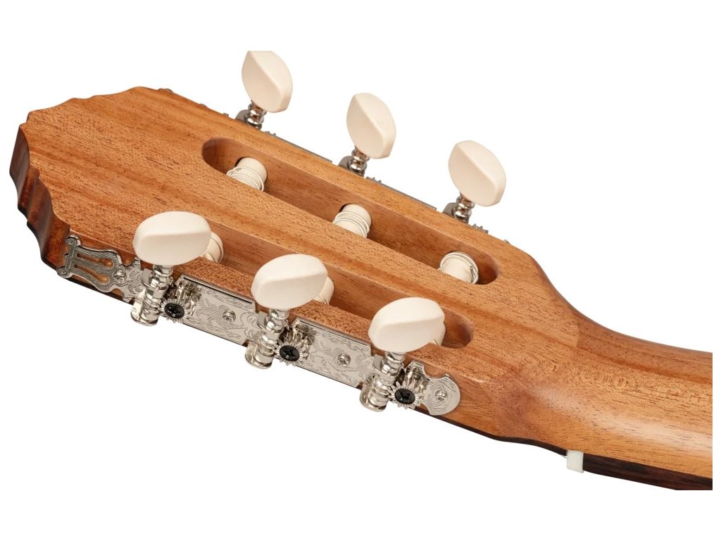 Struny jsou přes nultý a sedlový pražec z kosti uchyceny v klasických ladicích mechanikách a palisandrové kobylce. Pěkné zpracování podtrhuje matná úprava těla i krku, javorová lemovka a firemní logo na hlavici nástroje.