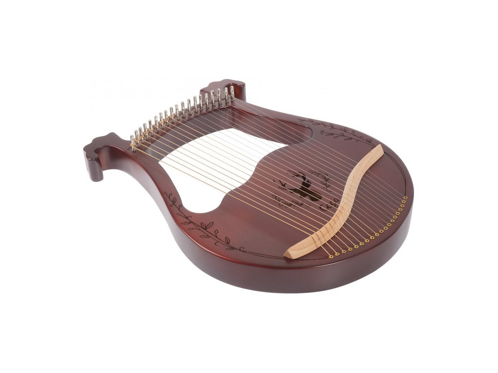 Harfa LH19C-T je v kávové barvě, má devatenáct strun a je zdobena řezbou okolo ozvučného otvoru ve tvaru jelena.