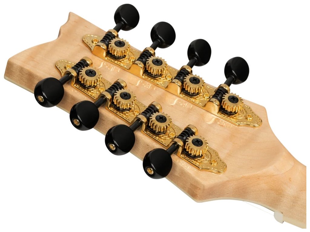 Struny jsou přes nultý pražec z kosti uchyceny ve firemních mechanikách ve zlatém provedení s černými kolíčky a kobylce a struníku. Pěkné zpracování podtrhuje obvodová lemovka z imitace slonoviny a dekorativní inlay na dvanáctém pražci.