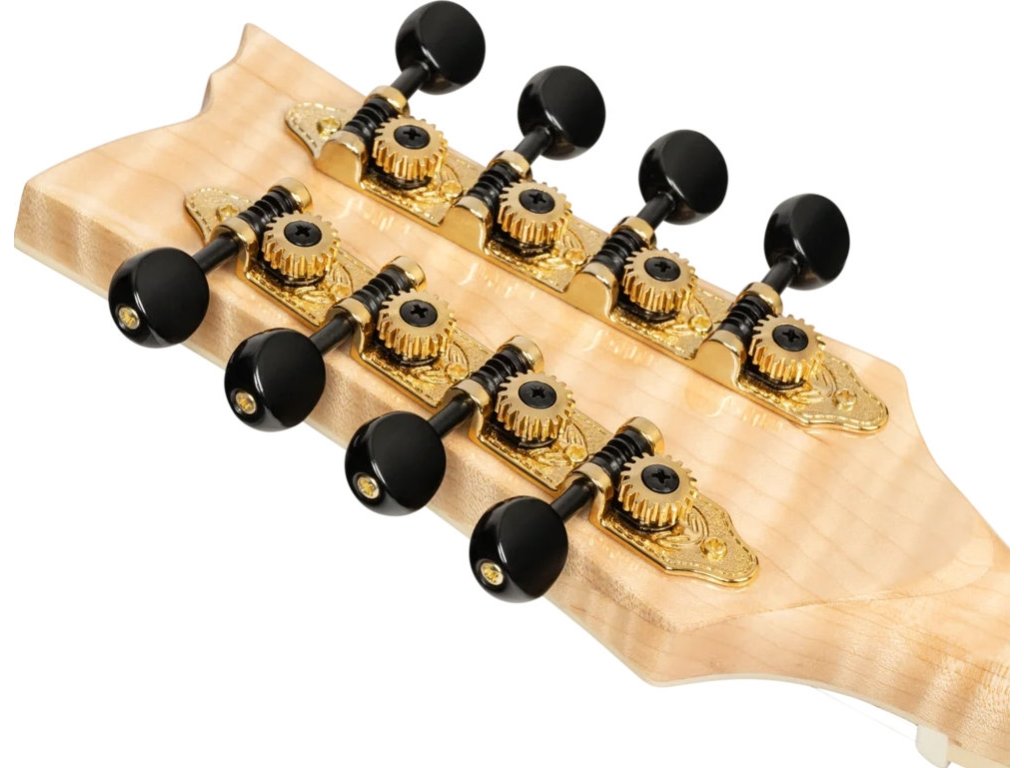 Struny jsou přes nultý pražec z kosti uchyceny ve firemních mechanikách ve zlatém provedení s černými kolíčky a kobylce a struníku. Pěkné zpracování podtrhuje obvodová lemovka z imitace slonoviny a dekorativní inlay na dvanáctém pražci.