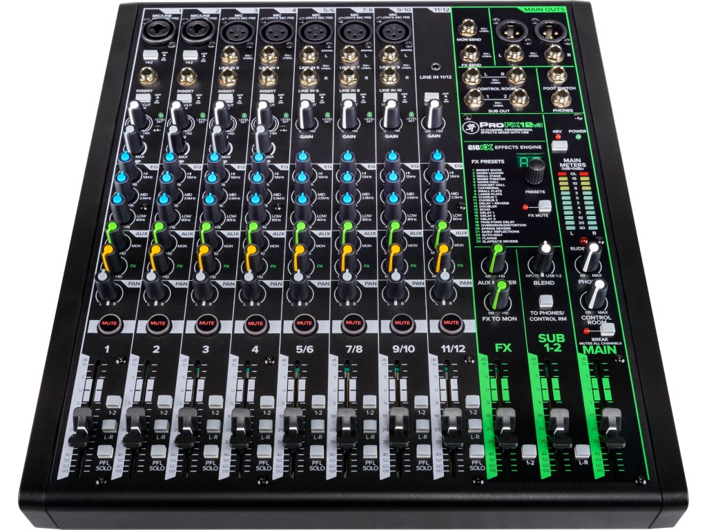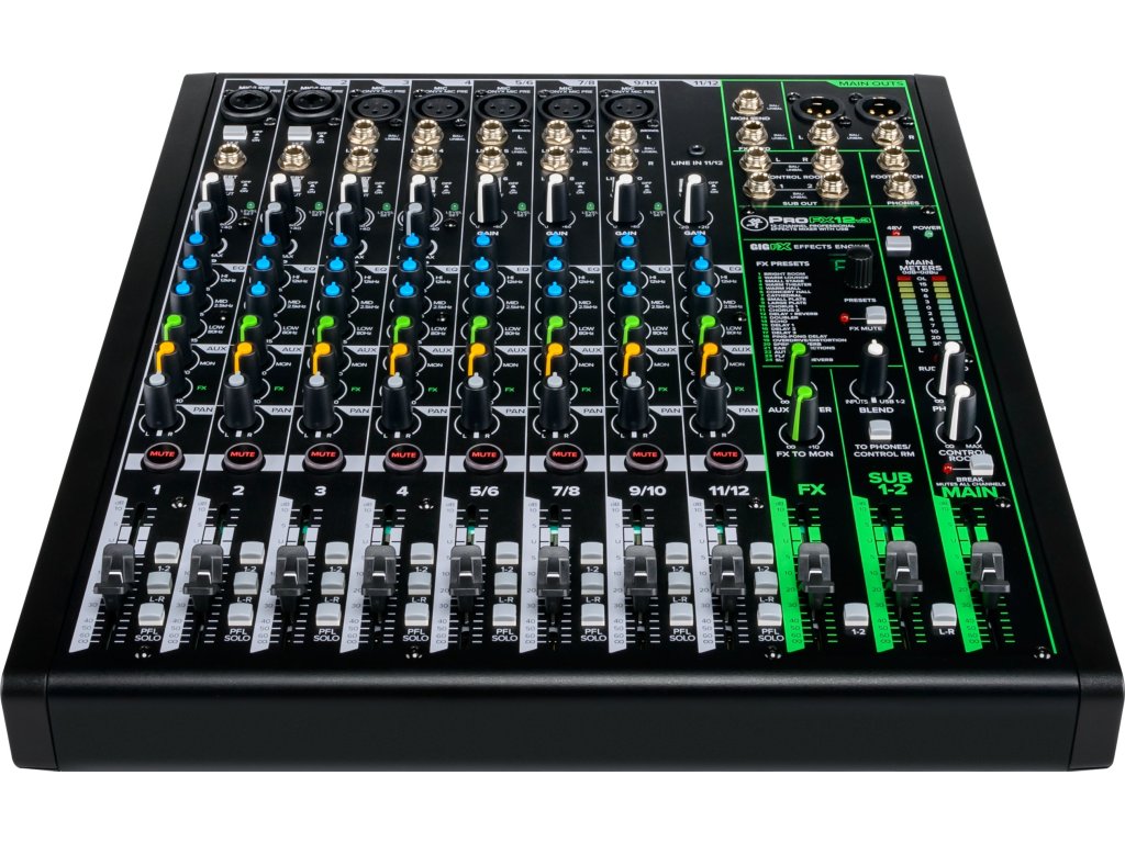 Konkrétně ProFX12v3 je dvanáctikanálový mixážní pult se sedmi Onyx preampy a GigFX zvukovým enginem. Zvuk lze nastavit pomocí intuitivních ovladačů a třípásmového ekvalizéru na každém kanálu, kromě dvou Kombi XLR/Jack vstupů disponuje pult také Hi-Z vstupem pro přímé zapojení kytary/baskytary, pěti XLR/stereo Jack vstupy a Line IN pro hudební přehrávač nebo mobilní zařízení. Dále zde najdete výstup pro monitory, hlavní výstup, výstup pro sluchátka a vstup pro footswitch.