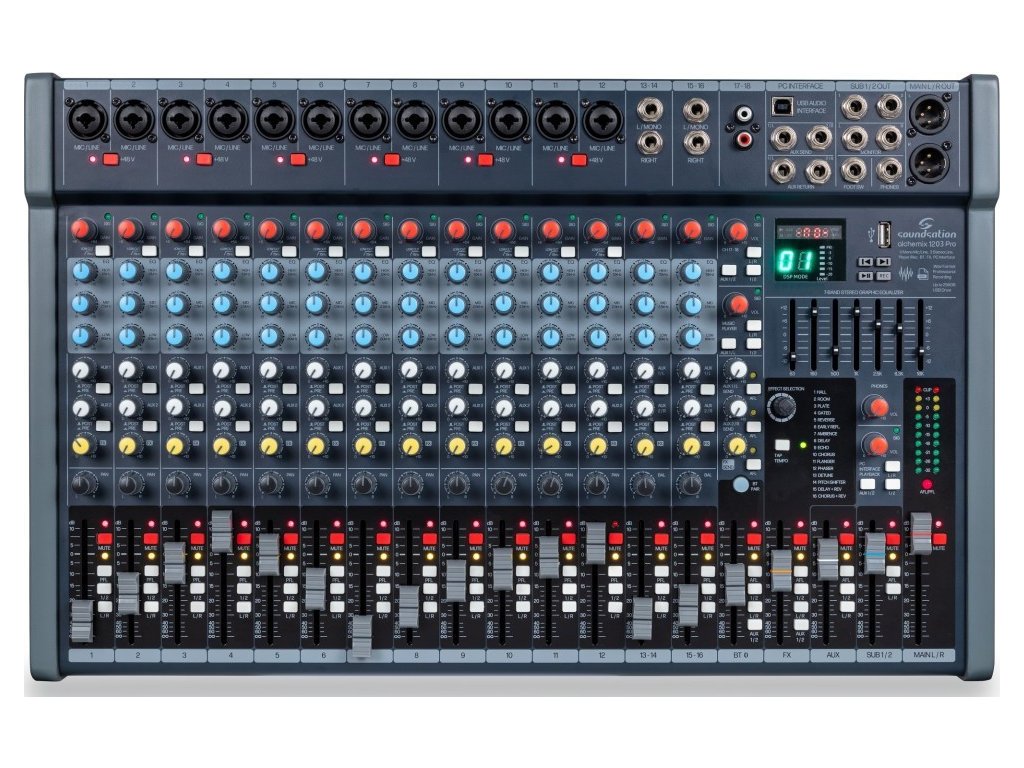 ALCHEMIX 1203 PRO je výkonný analogový mixážní pult navržený pro kapely, živé akce i náročnější domácí studia. Nabízí vysoký počet vstupů, intuitivní ovládání a bohatou výbavu včetně efektů, USB konektivity a bezdrátového přehrávání, díky čemuž představuje univerzální centrum pro živé ozvučení i nahrávání.
