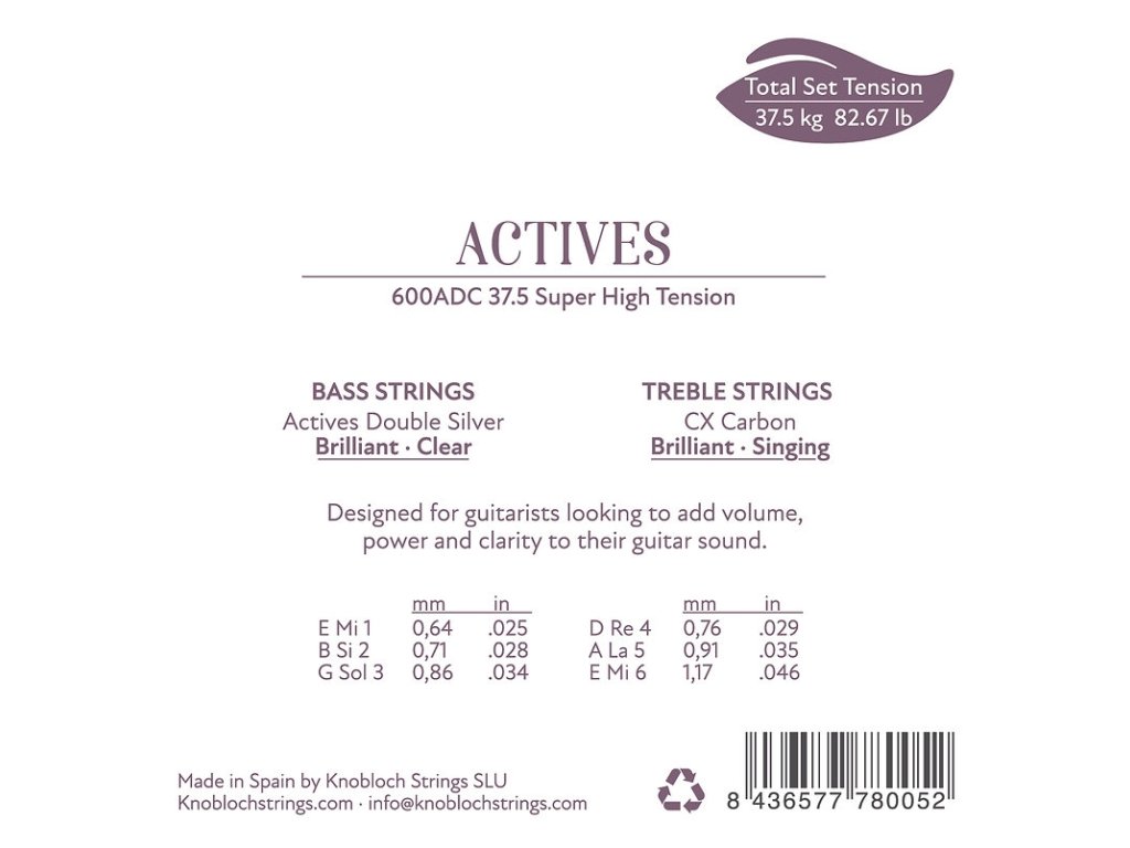 Nylonové struny z řady ACTIVES od společnosti Knobloch jsou tím nejlepším, co můžete své klasické kytaře dopřát za dostupnou cenu. Díky precizní intonaci, vysoké odolnosti a pohodlné hratelnosti neurazí ani ostřílené profesionály. V této sadě najdete kombinaci vysokých strun z karbonu, které se vyznačují zvonivým zvukem a basových strun potažených dvojitým stříbrem, které jsou zvukově jasné a čisté. Výsledkem jsou struny se silným tónem, v jejichž rejstříku vynikají zejména vysoké frekvence.