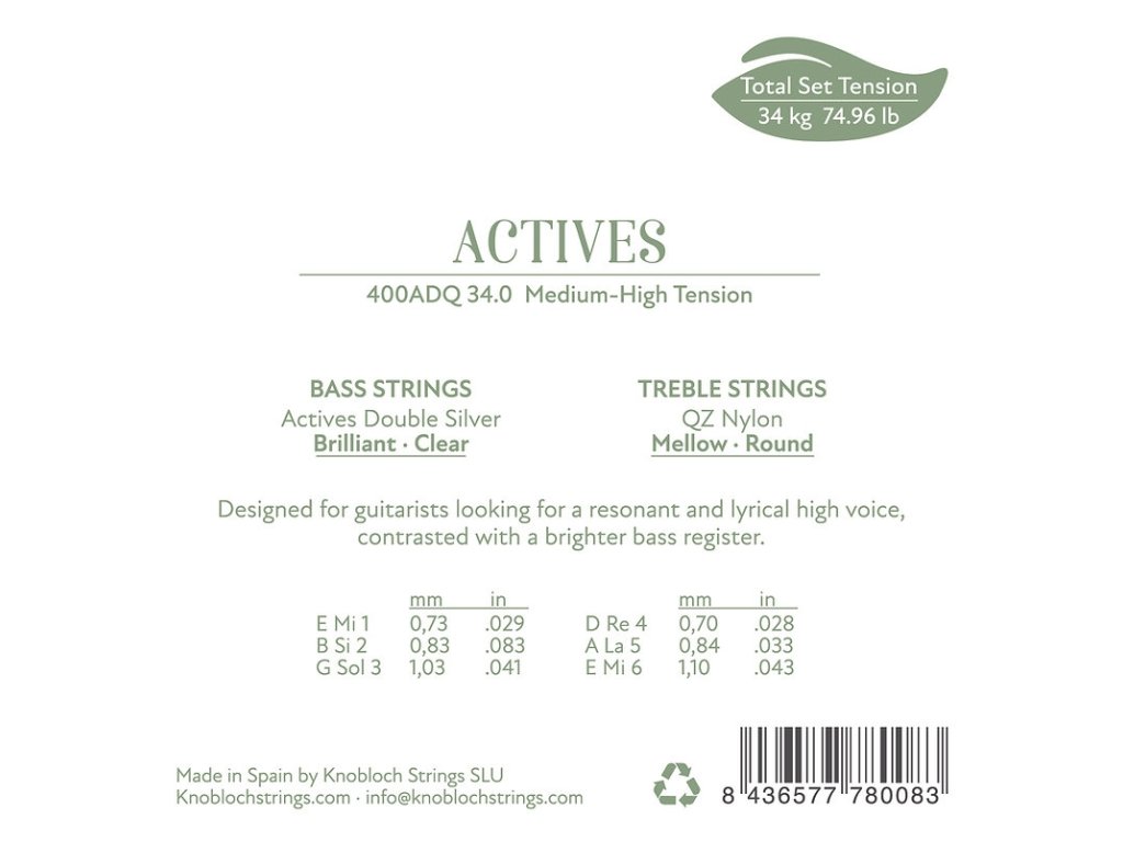 Nylonové struny z řady ACTIVES od společnosti Knobloch jsou tím nejlepším, co můžete své klasické kytaře dopřát za dostupnou cenu. Díky precizní intonaci, vysoké odolnosti a pohodlné hratelnosti neurazí ani ostřílené profesionály. V této sadě najdete kombinaci vysokých strun z QZ nylonu, které se vyznačují vřelým, zakulaceným zvukem a basových strun potažených dvojitým stříbrem, které jsou zvukově jasné a čisté. Výsledkem jsou frekvenčně vyvážené struny, v nichž se měkce rezonující výšky snoubí s kontrastními průraznými basy.