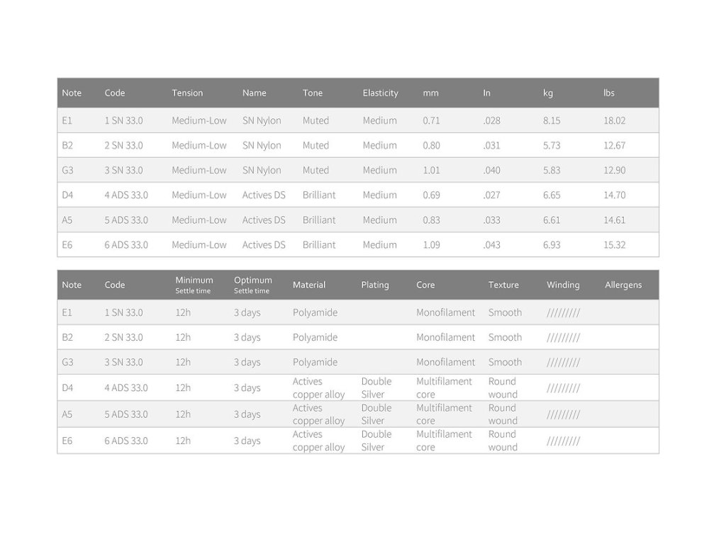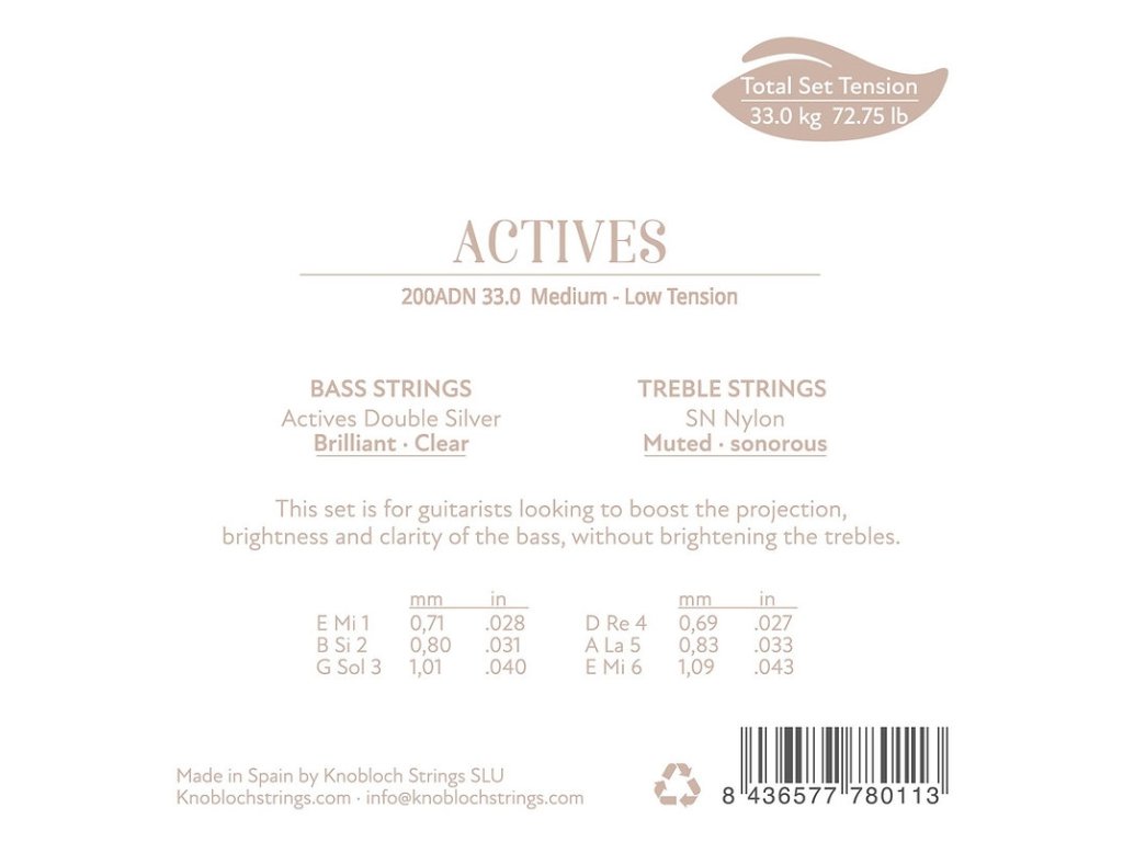 Nylonové struny z řady ACTIVES od společnosti Knobloch jsou tím nejlepším, co můžete své klasické kytaře dopřát za dostupnou cenu. Díky precizní intonaci, vysoké odolnosti a pohodlné hratelnosti neurazí ani ostřílené profesionály. V této sadě najdete kombinaci vysokých strun z SN nylonu, které se vyznačují tlumeným, ale přesto mohutným zvukem a basových strun potažených dvojitým stříbrem, které jsou zvukově jasné a čisté. Výsledkem jsou struny, u nichž dominují průrazné, rezonanční basy utlumené jemnějšími výškami.