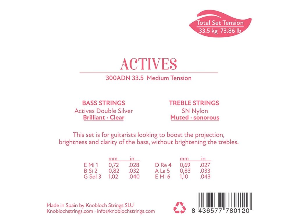 Nylonové struny z řady ACTIVES od společnosti Knobloch jsou tím nejlepším, co můžete své klasické kytaře dopřát za dostupnou cenu. Díky precizní intonaci, vysoké odolnosti a pohodlné hratelnosti neurazí ani ostřílené profesionály. V této sadě najdete kombinaci vysokých strun z SN nylonu, které se vyznačují tlumeným, ale přesto mohutným zvukem a basových strun potažených dvojitým stříbrem, které jsou zvukově jasné a čisté. Výsledkem jsou struny, u nichž dominují průrazné, rezonanční basy utlumené jemnějšími výškami.