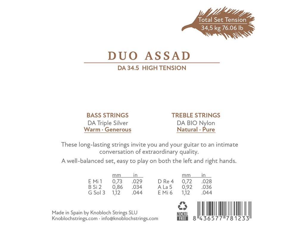 Nylonové struny z řady DUO ASSAD od španělské společnosti Knobloch byly vytvořeny pro náročné hráče na klasickou kytaru. Jsou výjimečné tím, že jejich basové struny jsou vinuté s opačném směru, než je běžné, díky čemuž jsou tišší a lépe přizpůsobené pravoruké hře. Basové struny potažené trojitým stříbrem dodají vaší kytaře novou zvukovou dimenzi, zatímco vysoké struny z bionylonu nabízejí čistý, přirozený tón. Výsledkem jsou zvučné struny, jež vynikají bohatou rezonancí, přirozeným zvukem a vřelostí. Zároveň poskytují precizní intonaci, vysokou odolnost a výjimečně pohodlnou hratelnost.