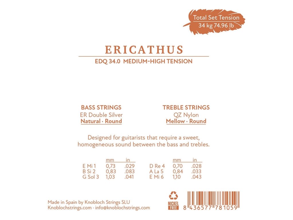 Řada ERITHACUS od společnosti Knobloch představuje profesionální struny pro náročné hráče, kteří se pídí po co nejpřirozenějším zvuku. Struny z této série jsou vřelejší než řada Active a vynikají hlubokými, zakulacenými basy, které jsou potaženy dvojitým stříbrem ER Double Silver. Ty jsou doplněny měkkým, kulatým tónem nevinutých strun z QZ nylonu. Výsledkem je přirozený a smyslný tón, který vás chytne za srdce. Struny navíc poskytují precizní intonaci, vysokou odolnost a pohodlnou hratelnost, která neurazí ani kytarové virtuózy.