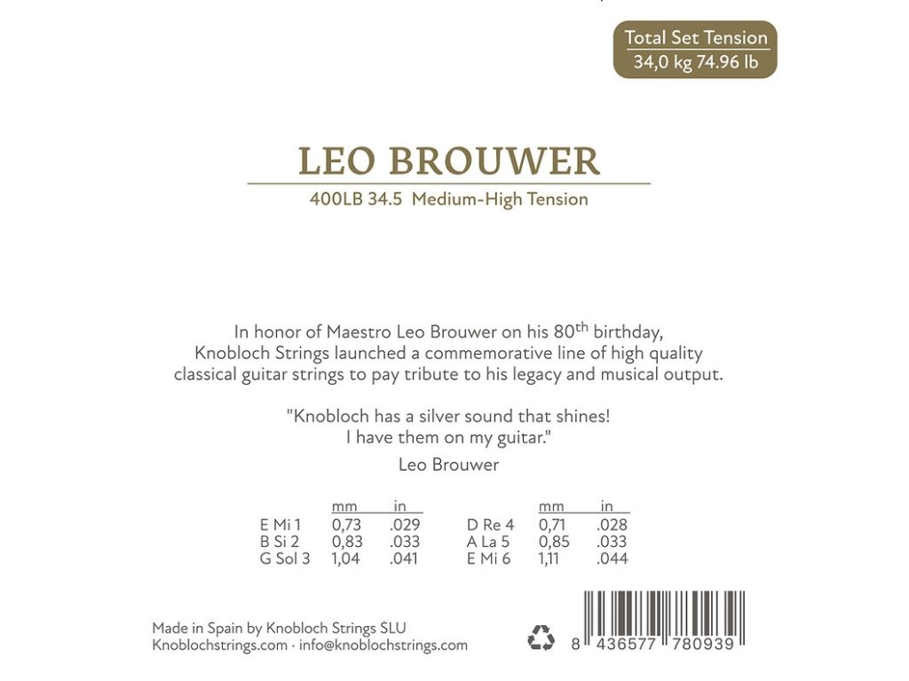 Nylonové struny pro klasickou kytaru ze série LEO BROUWERod španělské společnosti Knobloch byly vytvořeny k uctění odkazu kubánského kytarového maestra Lea Brouwera u příležitosti jeho 80. narozenin. Tyto struny představují vrcholný výraz úcty k jeho hudebnímu dědictví a jsou navrženy tak, aby poskytovaly hudebníkům cestu pro autentický projev emocí.