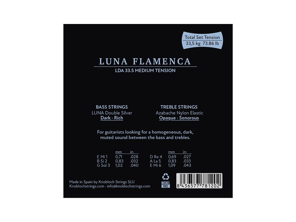 Řada flamencových strun LUNA FLAMENCA od společnosti Knobloch představuje výjimečně kvalitní struny pro klasickou kytaru určené speciálně pro hráče flamenca. Basové struny z dvojitého stříbra Luna mají mohutný, hluboký tón, který vytváří tajemnou atmosféru, zatímco vysoké nevinuté struny vyrobené z AZ nylonu jsou hutné a bohaté. Výsledkem jsou zvučné struny s temnějším zvukovým charakterem, který se skvěle hodí pro styl, pro který byly vytvořeny.