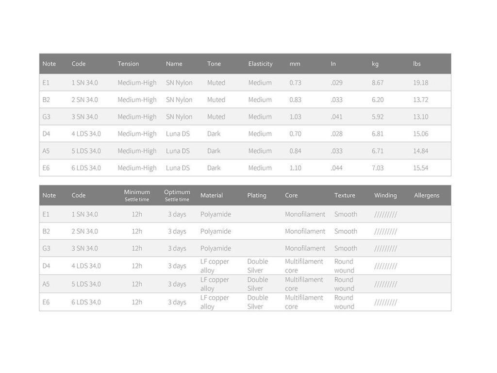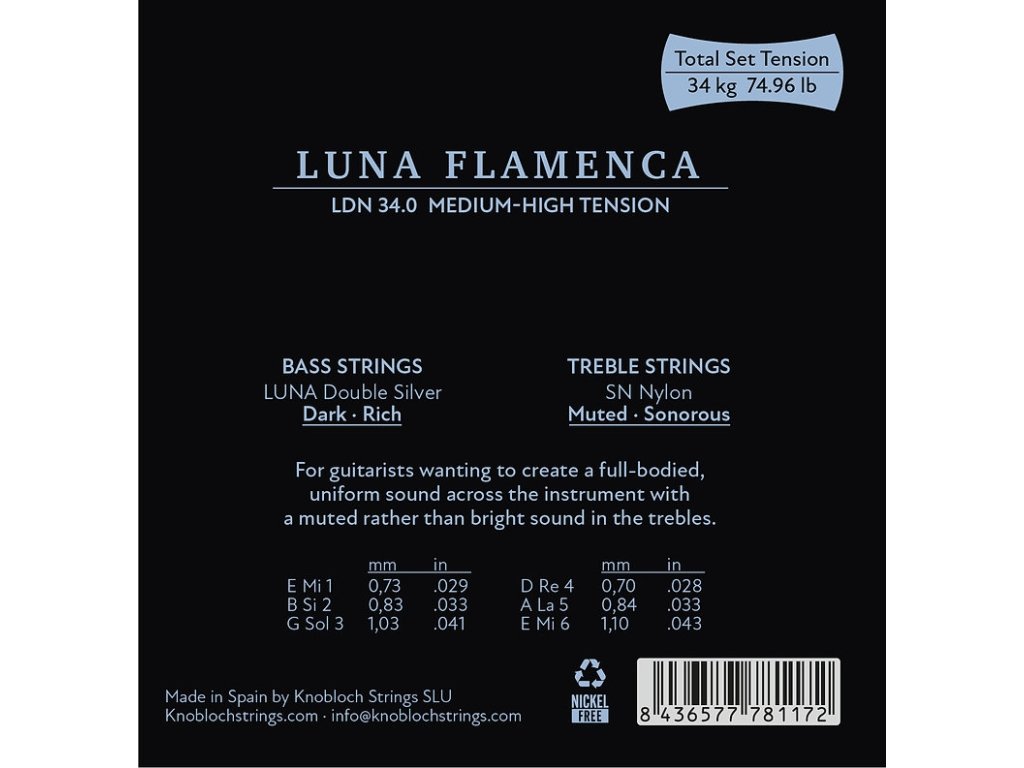 Řada flamencových strun LUNA FLAMENCA od společnosti Knobloch představuje výjimečně kvalitní struny pro klasickou kytaru určené speciálně pro hráče flamenca. Basové struny z dvojitého stříbra Luna mají mohutný, hluboký tón, který vytváří tajemnou atmosféru, zatímco vysoké nevinuté struny vyrobené z SN nylonu jsou zastřené a syté. Výsledkem jsou tlumené struny s temnějším zvukovým charakterem, který se skvěle hodí pro styl, pro který byly vytvořeny.