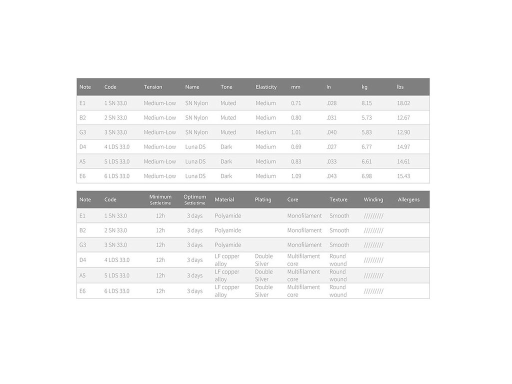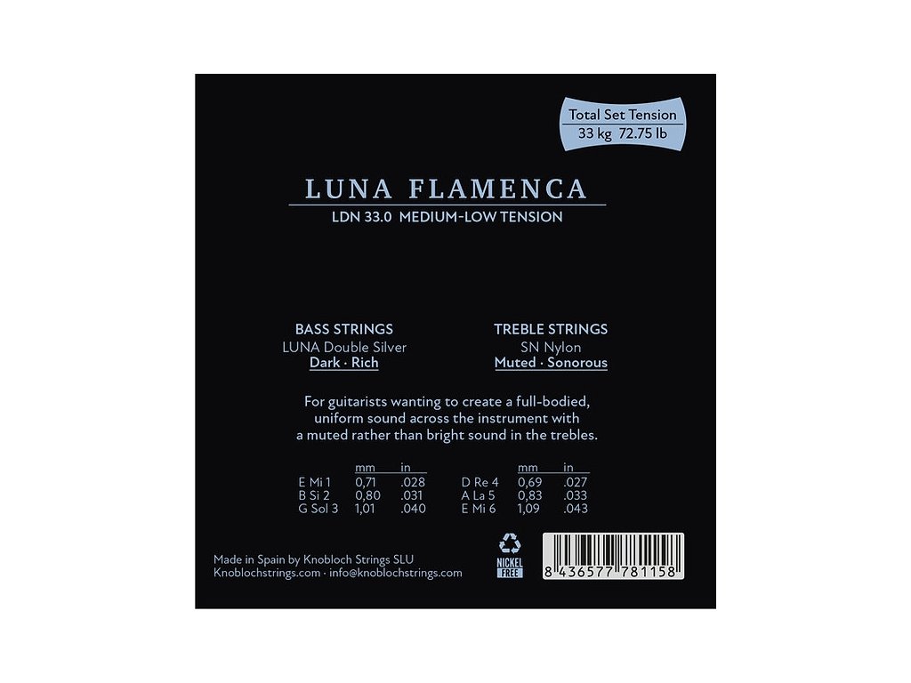 Řada flamencových strun LUNA FLAMENCA od společnosti Knobloch představuje výjimečně kvalitní struny pro klasickou kytaru určené speciálně pro hráče flamenca. Basové struny z dvojitého stříbra Luna mají mohutný, hluboký tón, který vytváří tajemnou atmosféru, zatímco vysoké nevinuté struny vyrobené z SN nylonu jsou zastřené a syté. Výsledkem jsou tlumené struny s temnějším zvukovým charakterem, který se skvěle hodí pro styl, pro který byly vytvořeny.