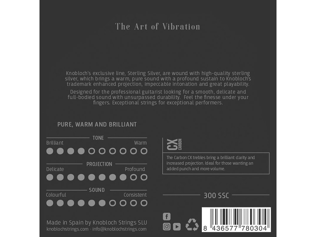 Exkluzivní řada nylonových strun STERLING od společnosti Knobloch představuje tu nejvyšší možnou kvalitu, jakou můžete své klasické kytaře dopřát. Jejich basové struny jsou potažené tzv. sterlingovým stříbrem, jež obsahuje minimálně 92,5 % stříbra a 7,5 % jiné příměsi. Díky tomu vynikají vřelým zvukem, ohromným sustainem a bezkonkurenční životností. Hluboký tón basů je projasněn zvonivostí vysokých strun z karbonu. Výsledkem jsou jasné vysoké frekvence vyznívající nad bohatým basovým rejstříkem, jenž připomíná rezonující violoncello.
