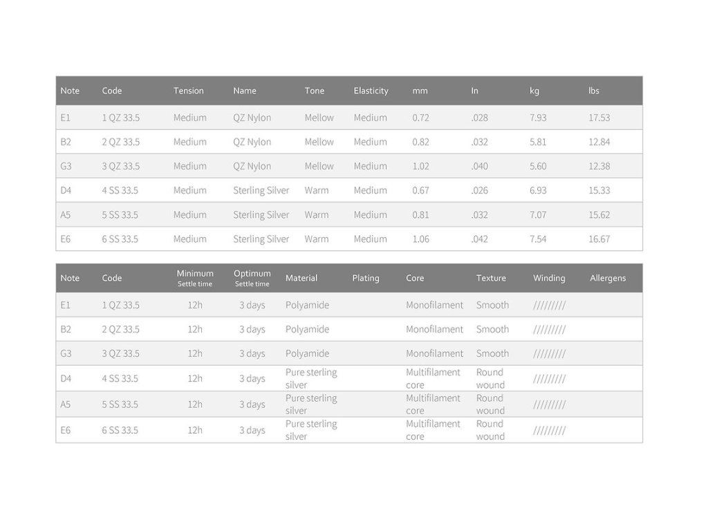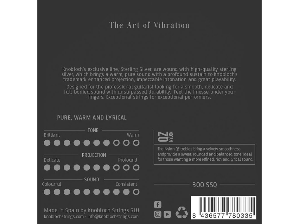 Exkluzivní řada nylonových strun STERLING od společnosti Knobloch představuje tu nejvyšší možnou kvalitu, jakou můžete své klasické kytaře dopřát. Jejich basové struny jsou potažené tzv. sterlingovým stříbrem, jež obsahuje minimálně 92,5 % stříbra a 7,5 % jiné příměsi. Díky tomu vynikají vřelým zvukem, ohromným sustainem a bezkonkurenční životností. Hluboký tón basů je vhodně doplněn zakulaceným zvukem vysokých strun z QZ nylonu. Výsledkem je celkově silný, rezonující tón, který vás díky své vřelosti pohladí na duši.