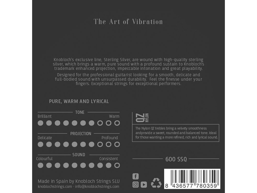Exkluzivní řada nylonových strun STERLING od společnosti Knobloch představuje tu nejvyšší možnou kvalitu, jakou můžete své klasické kytaře dopřát. Jejich basové struny jsou potažené tzv. sterlingovým stříbrem, jež obsahuje minimálně 92,5 % stříbra a 7,5 % jiné příměsi. Díky tomu vynikají vřelým zvukem, ohromným sustainem a bezkonkurenční životností. Hluboký tón basů je vhodně doplněn zakulaceným zvukem vysokých strun z QZ nylonu. Výsledkem je celkově silný, rezonující tón, který vás díky své vřelosti pohladí na duši.