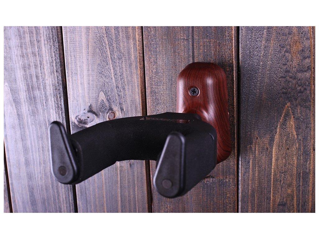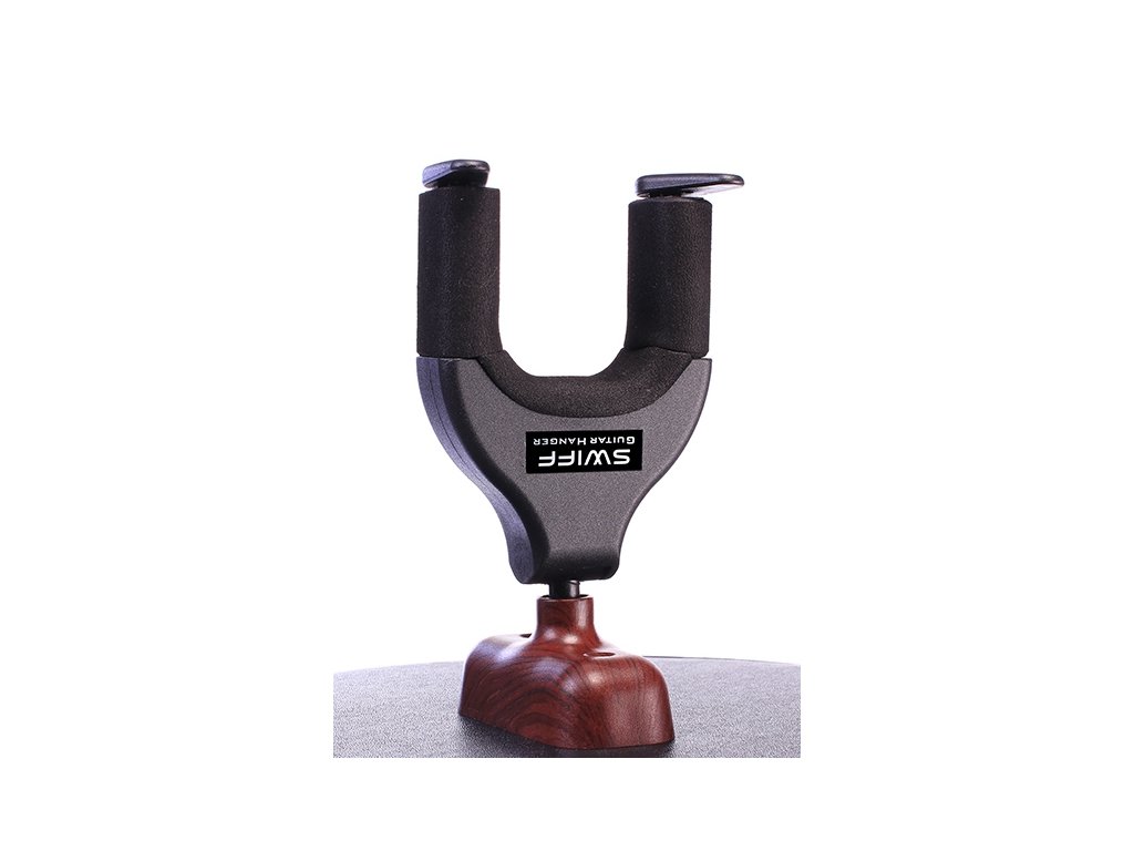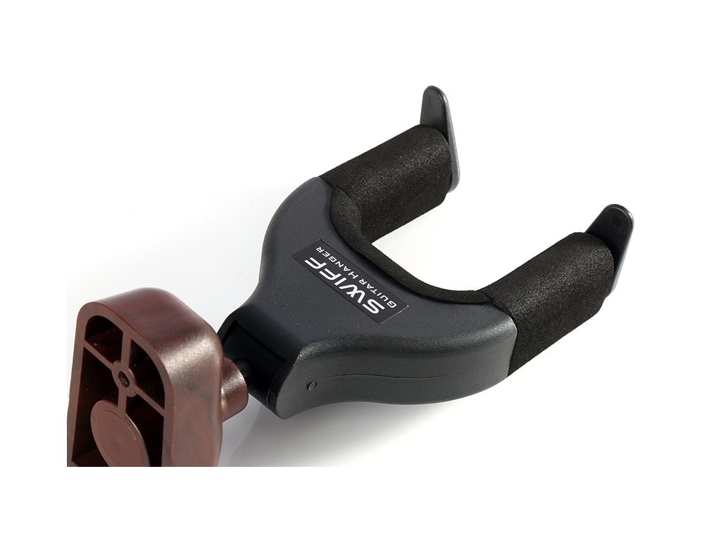 Kytarový věšák Swiff U1-B nabízí perfektní řešení pro zavěšení vašeho nástroje. Disponuje ochrannými zámky, které se při vložení nástroje automaticky zavřou a zabrání tak jeho pádu a případnému poškození. Otočná hlava věšáku se přizpůsobí různorodým tvarům kytarových hlav i jiným nástrojům, takže spolehlivě udrží akustiku, klasiku, elektriku, baskytaru, mandolínu nebo například banjo. Všechny části věšáku, které se dotýkají nástroje, jsou vystlané měkkou pěnou, takže se nemusíte obávat poškrábání. Tento model má plastovou základnu, která svým designem imituje tmavé dřevo, takže bude skvěle vynikat v jakémkoliv interiéru.
