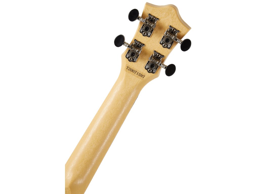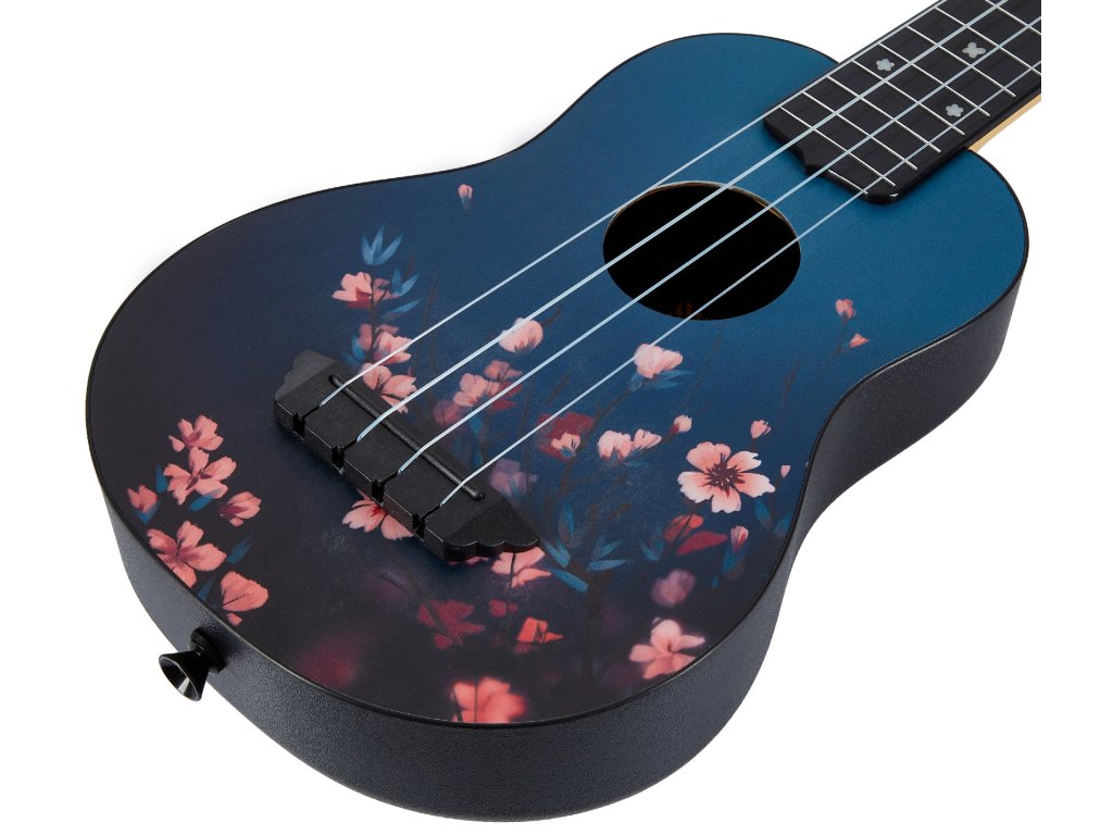 Korpus tohoto sopránového ukulele je složen z plastového těla a přední desky z laminované lípy, kterou zdobí barevné grafické motivy. Širší klenutá zadní deska ukulele umožňuje nástroji rezonovat jasnějším hlasitějším zvukem, než nabízí standardní sopránové modely. Krk i hmatník jsou rovněž zhotoveny z plastového materiálu ABS, kdy design krku imituje strukturu dřeva. Struny jsou přes plastový nultý a sedlový pražec ukotveny v ladicích mechanikách kytarového typu (Geared) a plastové kobylce. Stylový vzhled nástroje podtrhuje javorová dýha na hlavici barevně sladěná s úpravou topu.